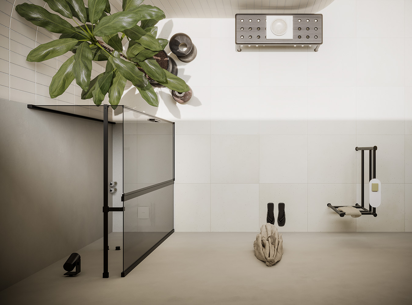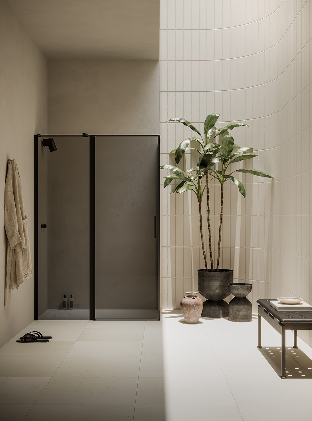 Notes Hinge integrated in the vertical profile, 180° opening, glass panel directly mounted into the tray.