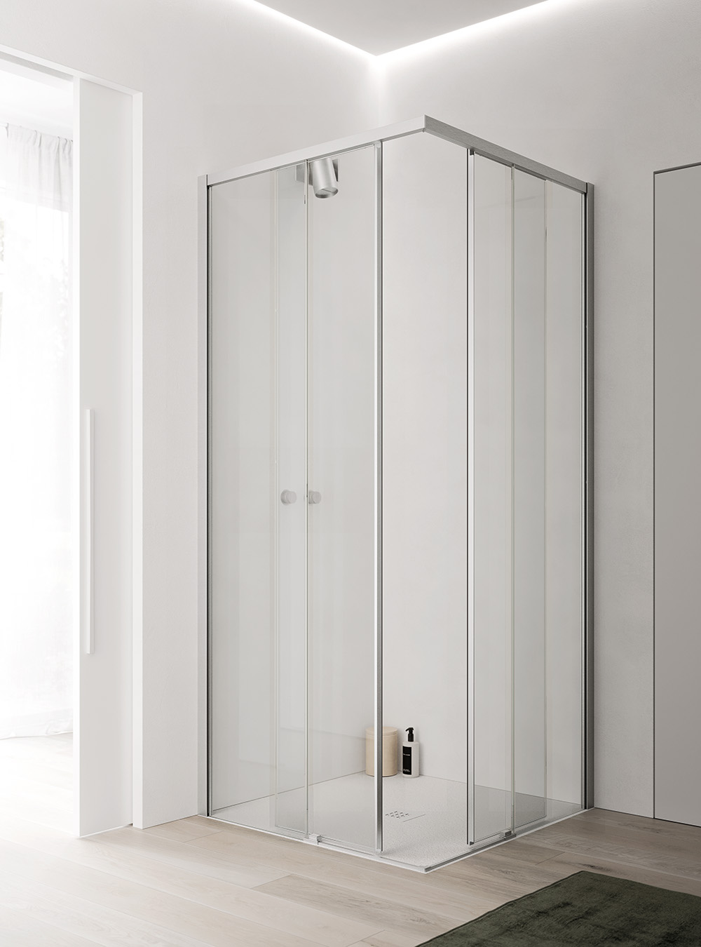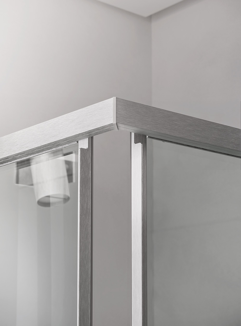 In the configuration with 2 sliding doors profiles are 45° cut for a minimalist junction.