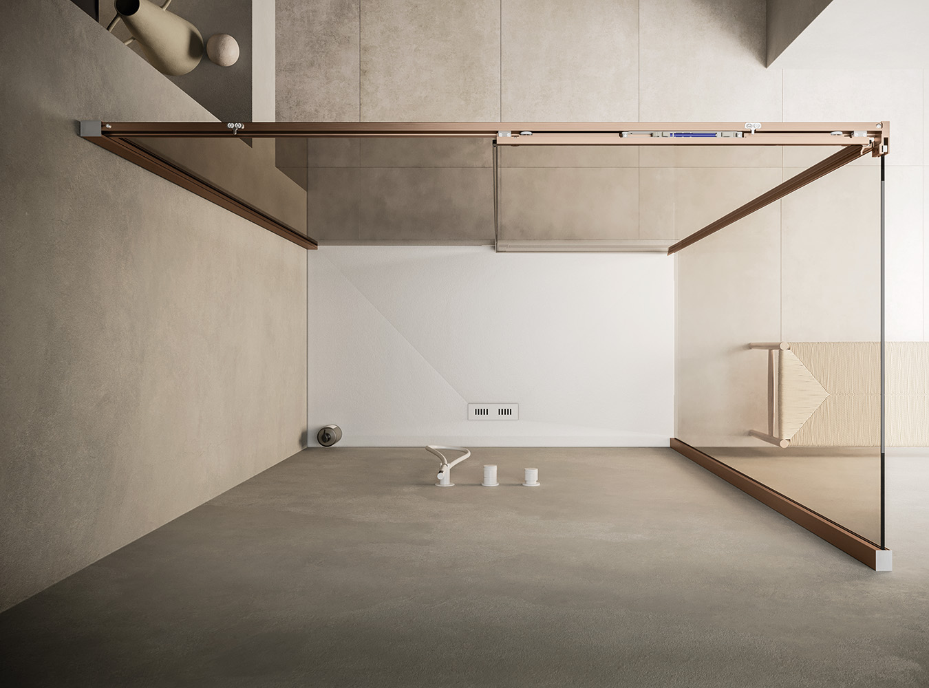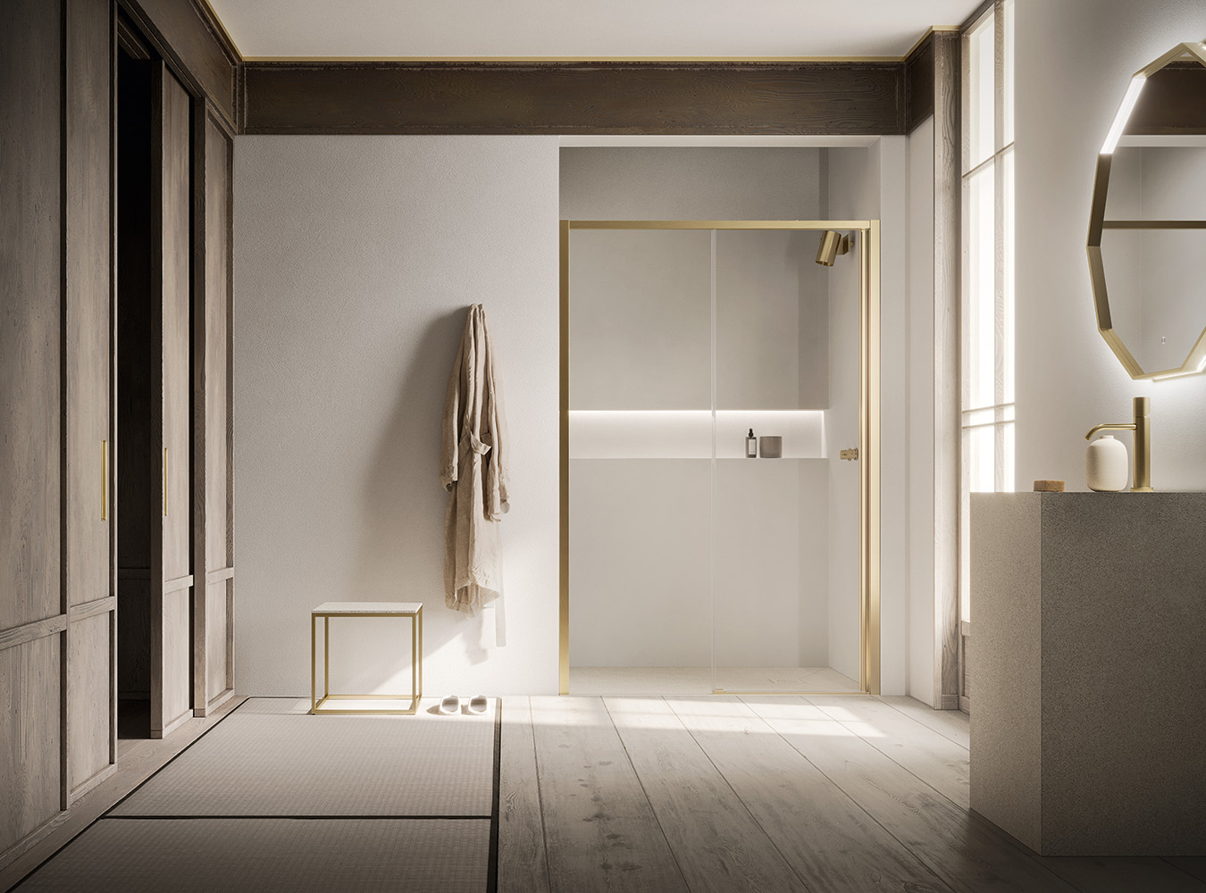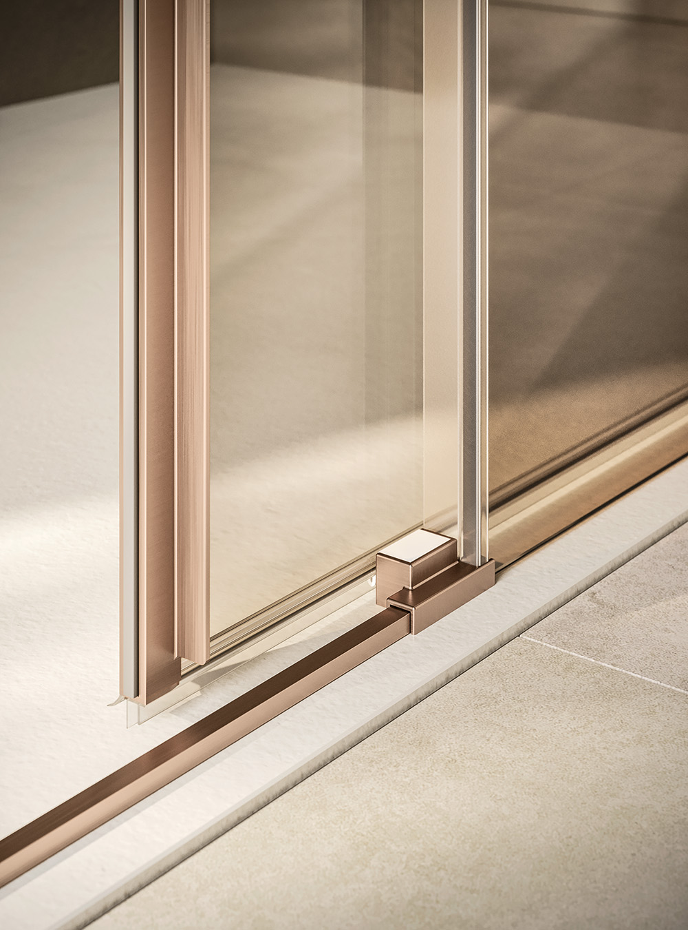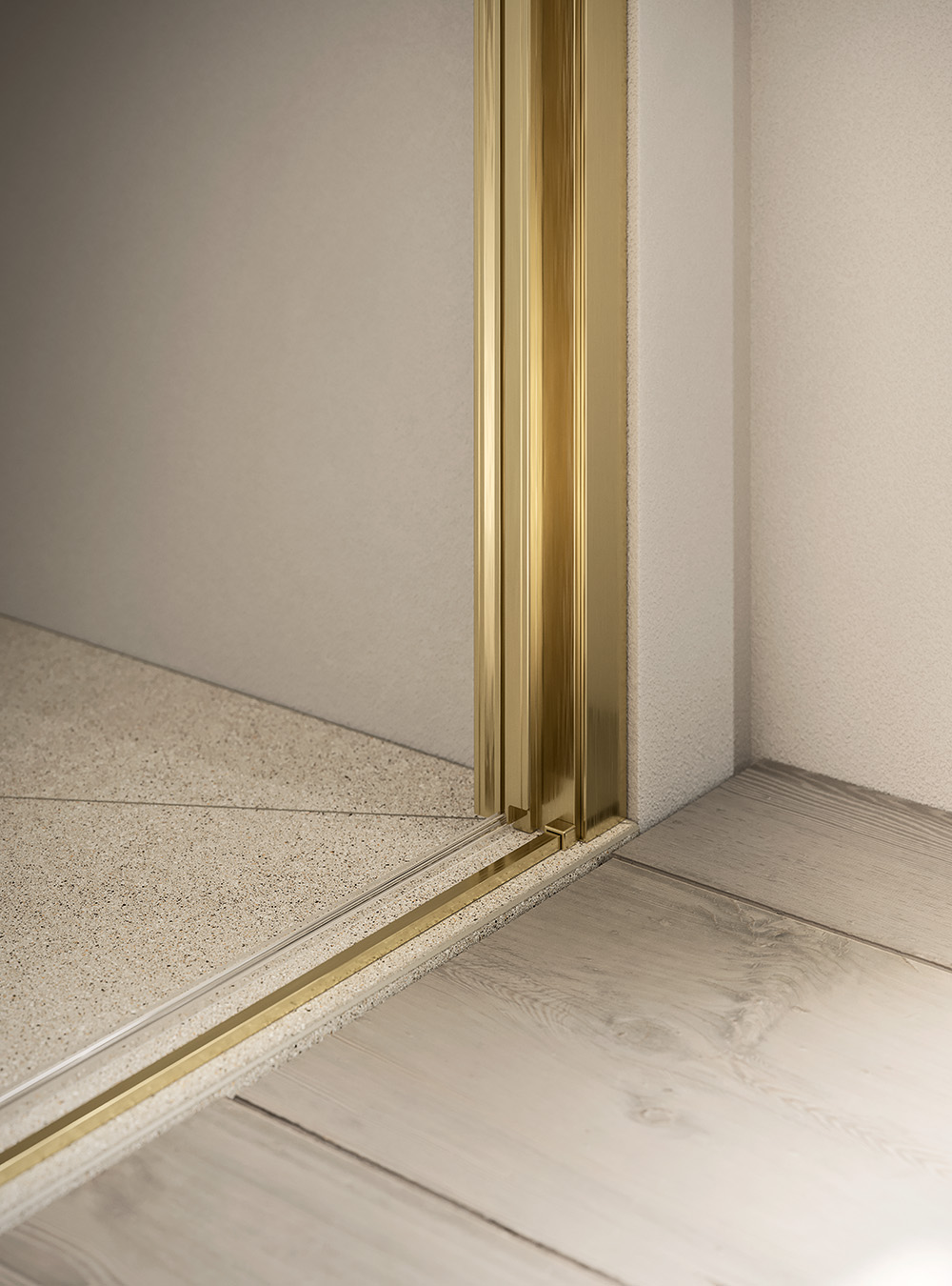 In the configuration with 2 sliding doors profiles are 45° cut for a minimalist junction.