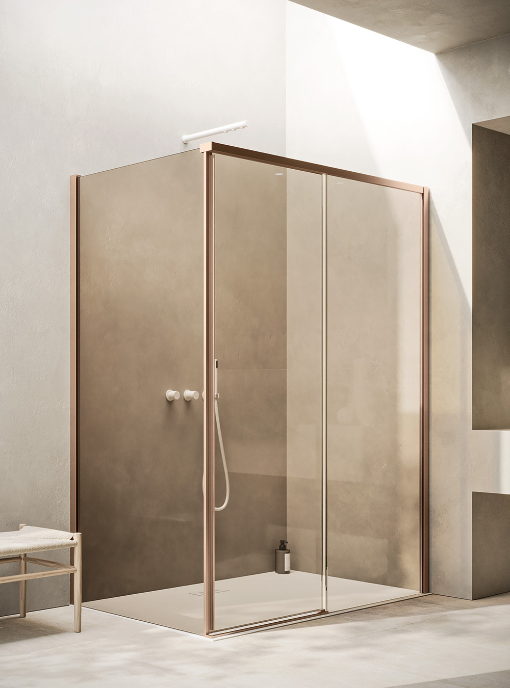 VENTO sliding door with in-line fixed panel + shaped fixed lateral panel
