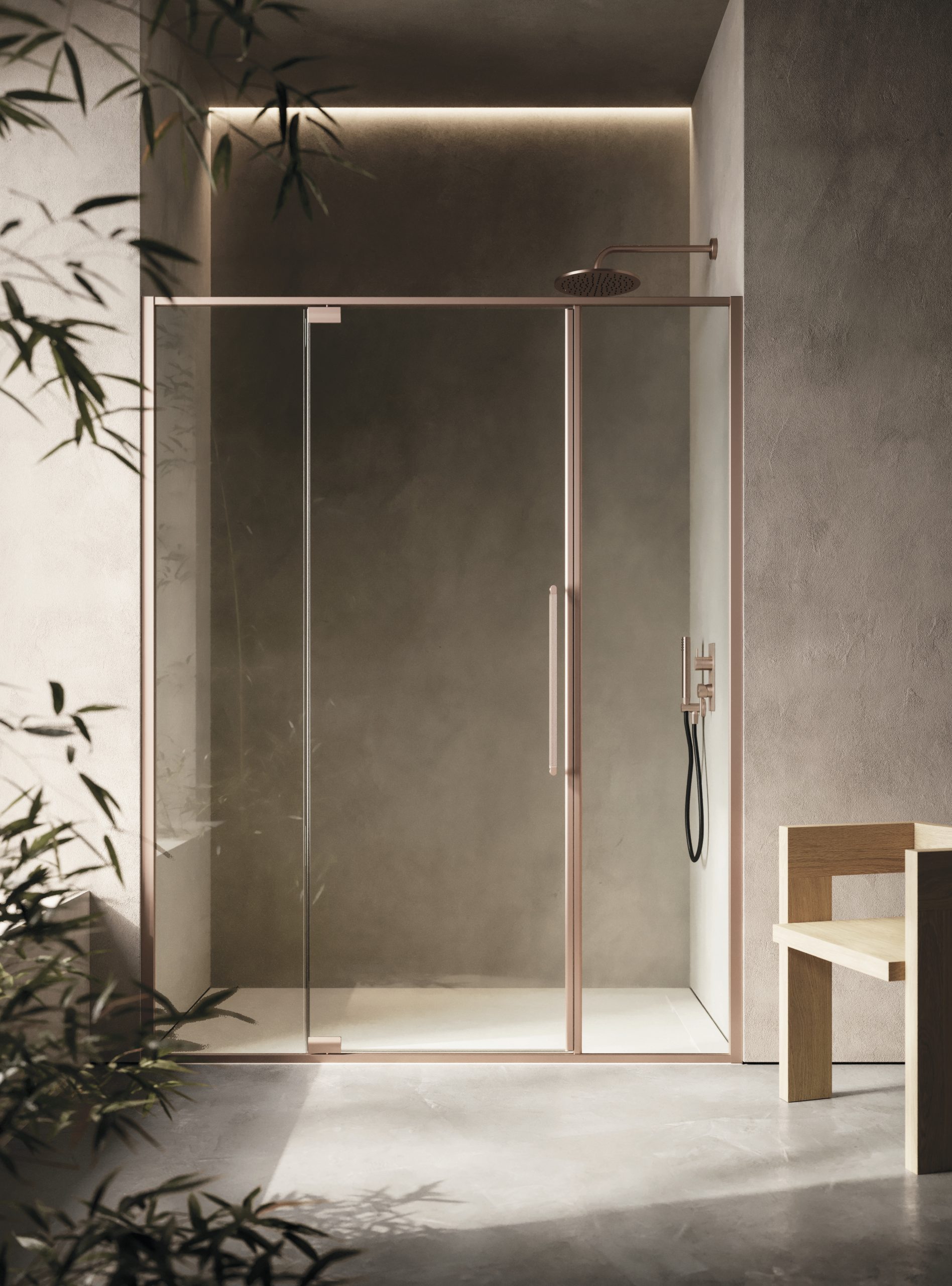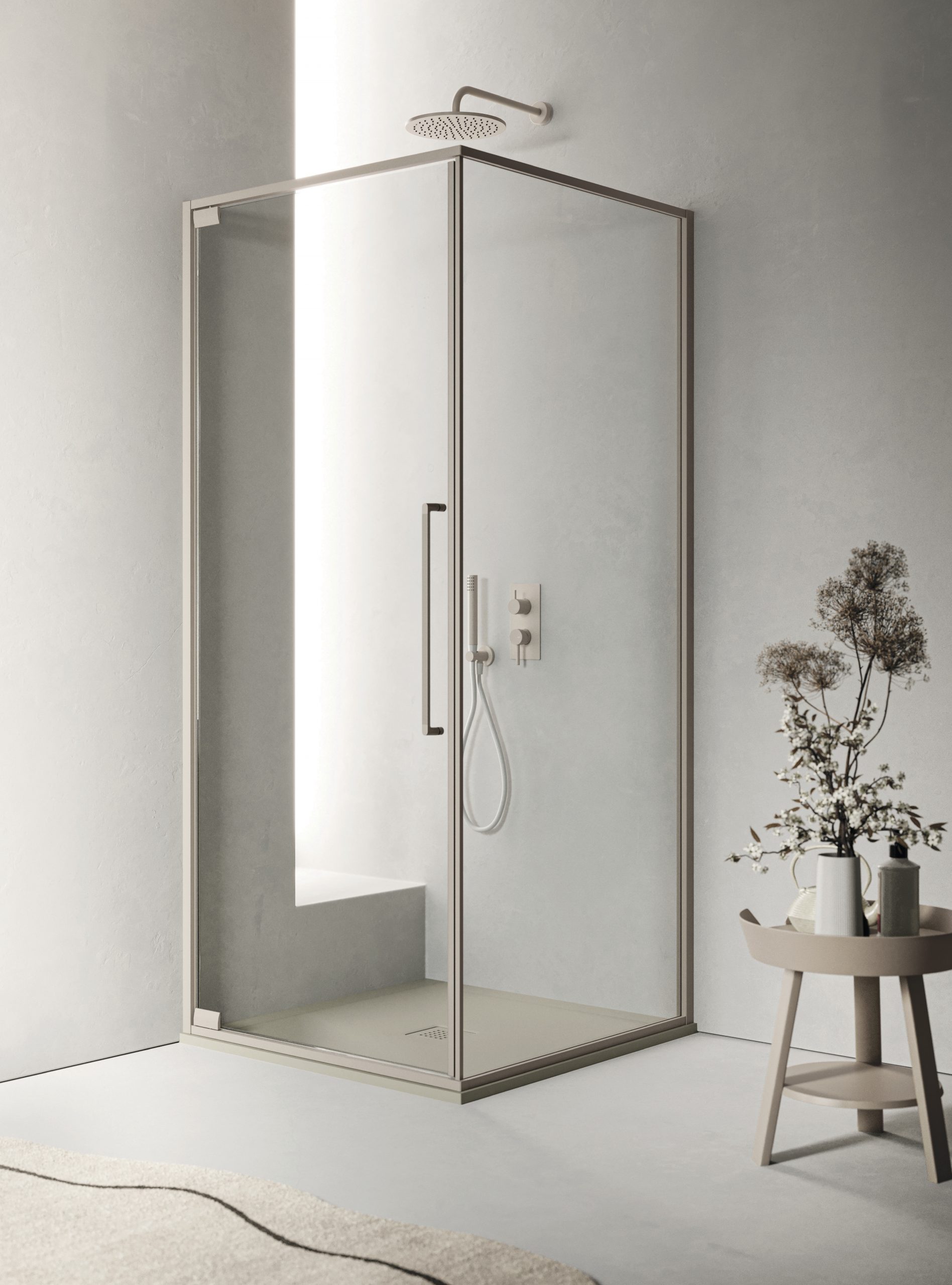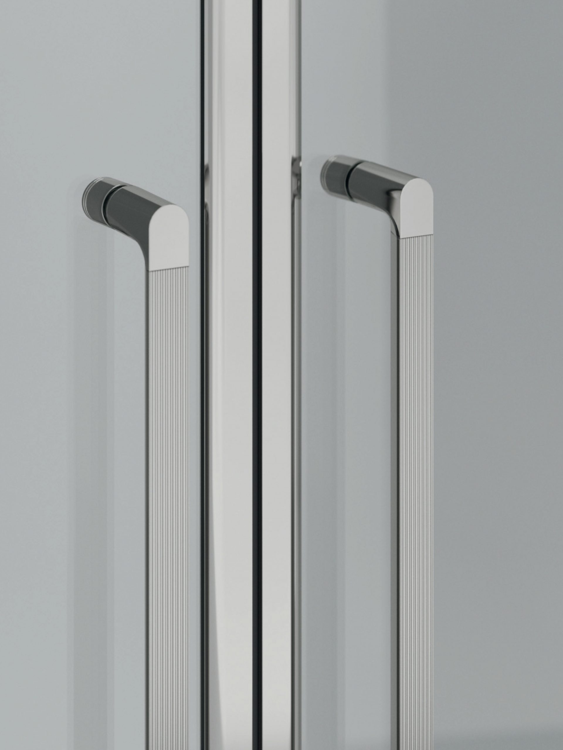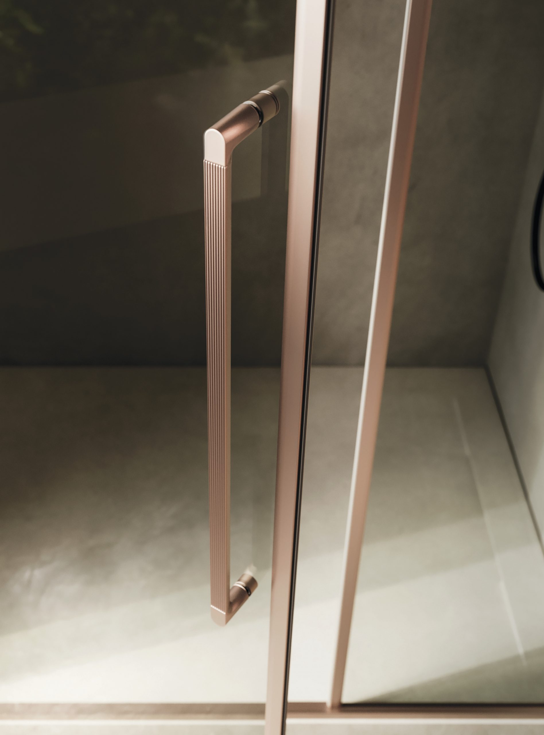 The Zefiro shower enclosure, featuring 6 mm glass thickness, redefines the pivot opening system by blending a bold, minimalist design with refined attention to detail. Expertise in raw material processing has led to the development of an extremely stable support bar with a reduced footprint. The result is a captivating and versatile aesthetic, capable of integrating discreetly into any interior architecture. The hinge’s sharp, minimalist design is softened by a subtle horizontal bevel, adding a touch of elegance and sophistication. The Zefiro handle, crafted from aluminum with a distinctive fluted (cannettato) effect, is supported by finely curved attachments that combine ergonomics with sophisticated design.