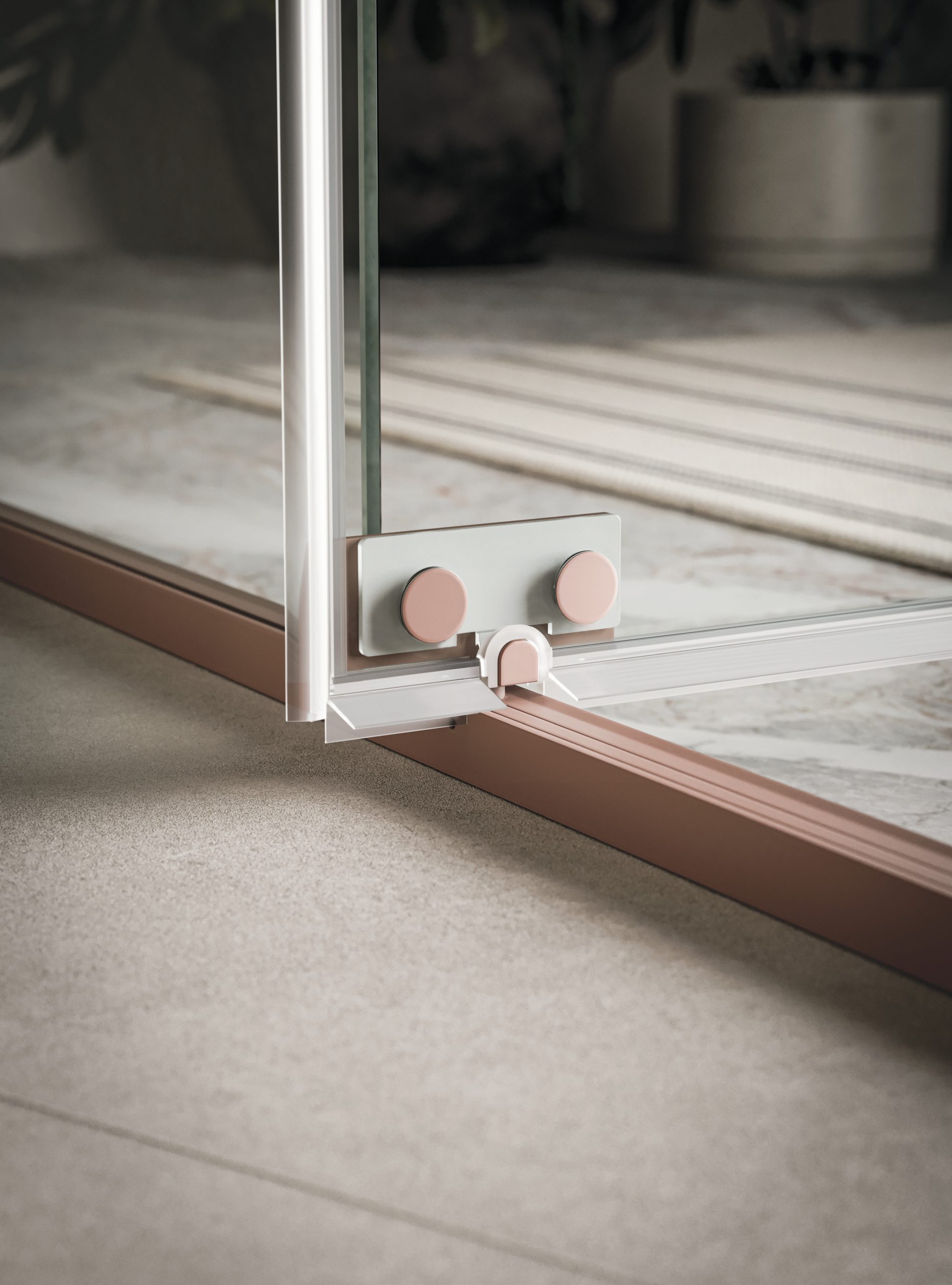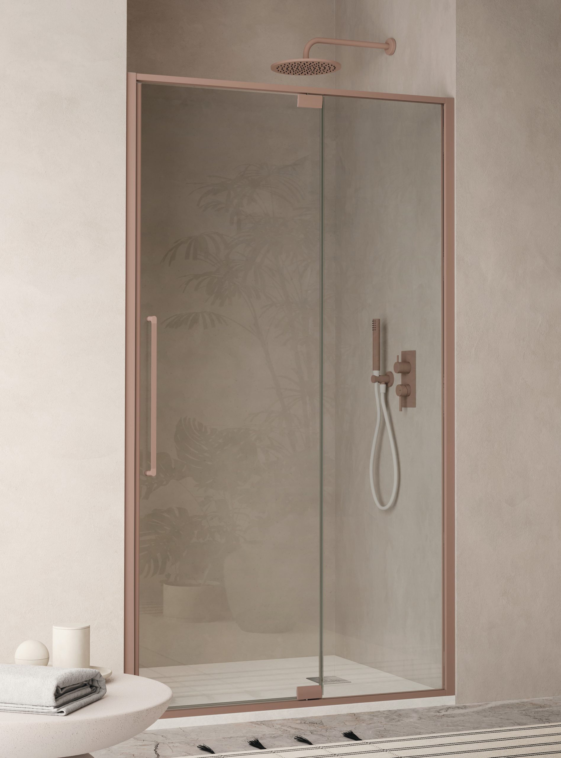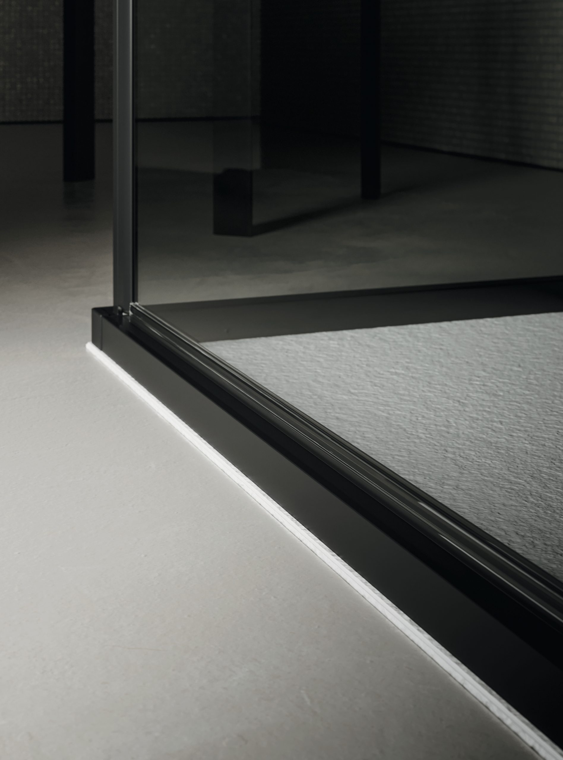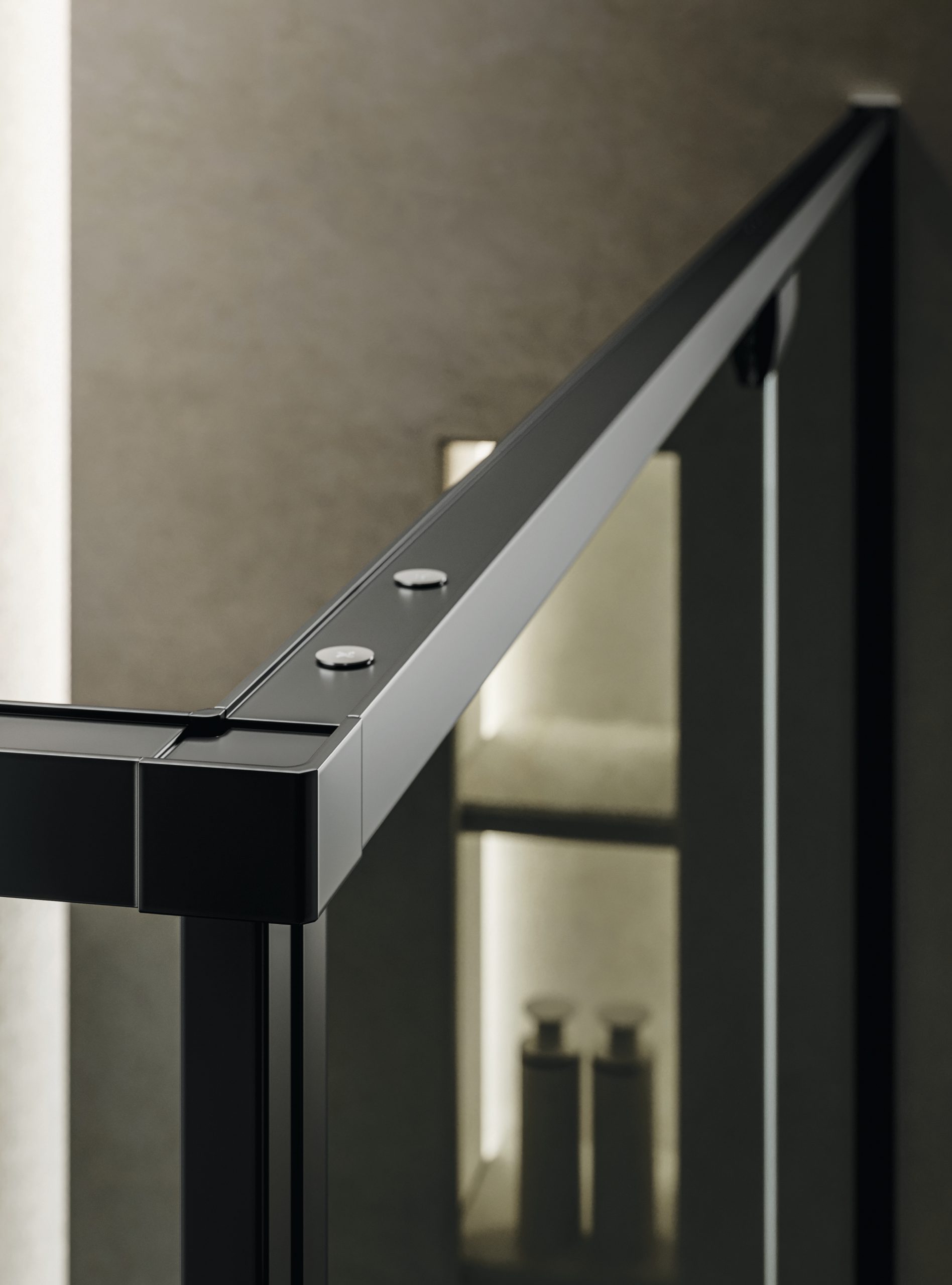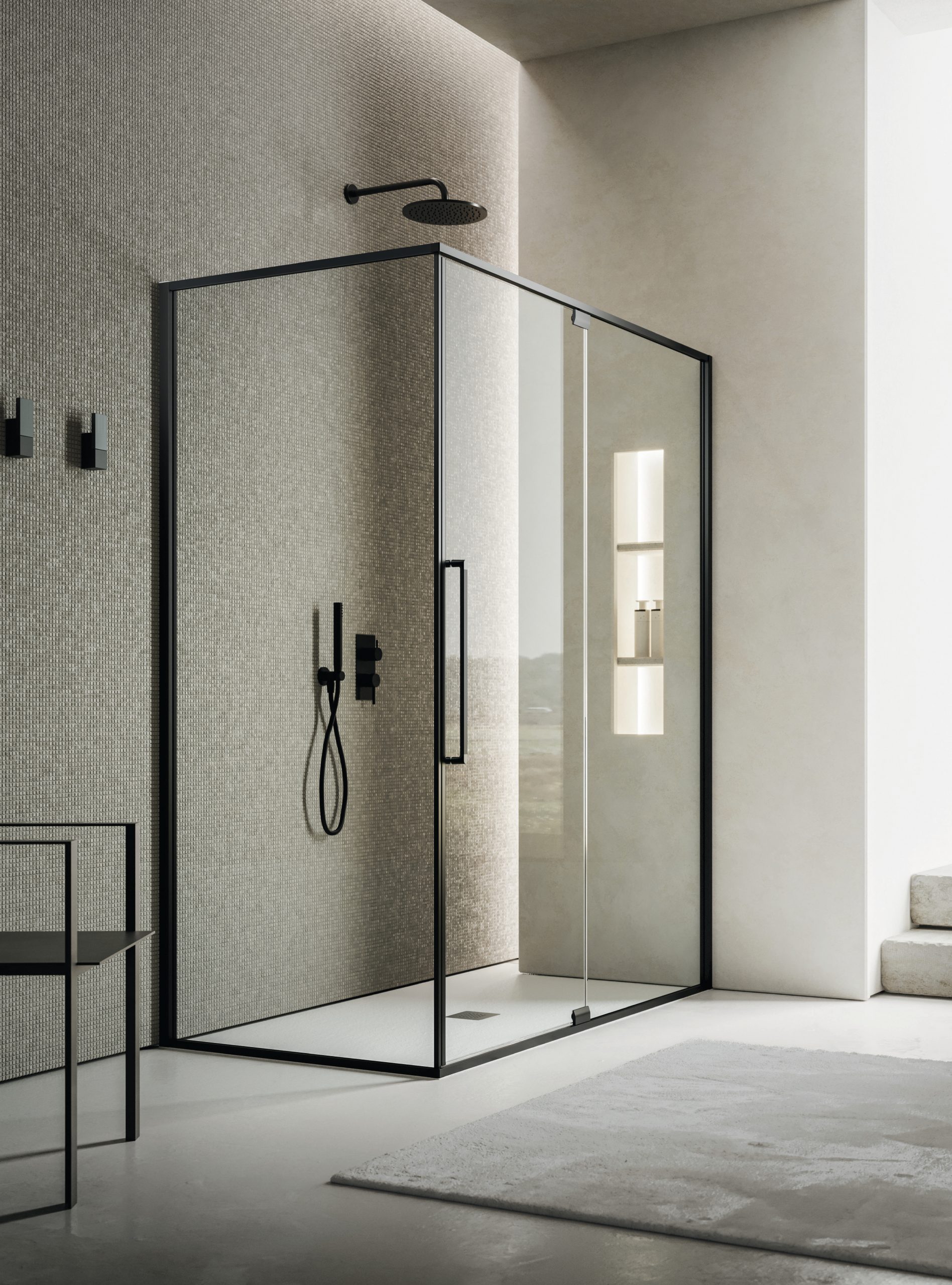 The Zefiro shower enclosure, featuring 6 mm glass thickness, redefines the pivot opening system by blending a bold, minimalist design with refined attention to detail. Expertise in raw material processing has led to the development of an extremely stable support bar with a reduced footprint. The result is a captivating and versatile aesthetic, capable of integrating discreetly into any interior architecture. The hinge’s sharp, minimalist design is softened by a subtle horizontal bevel, adding a touch of elegance and sophistication. The Zefiro handle, crafted from aluminum with a distinctive fluted (cannettato) effect, is supported by finely curved attachments that combine ergonomics with sophisticated design.